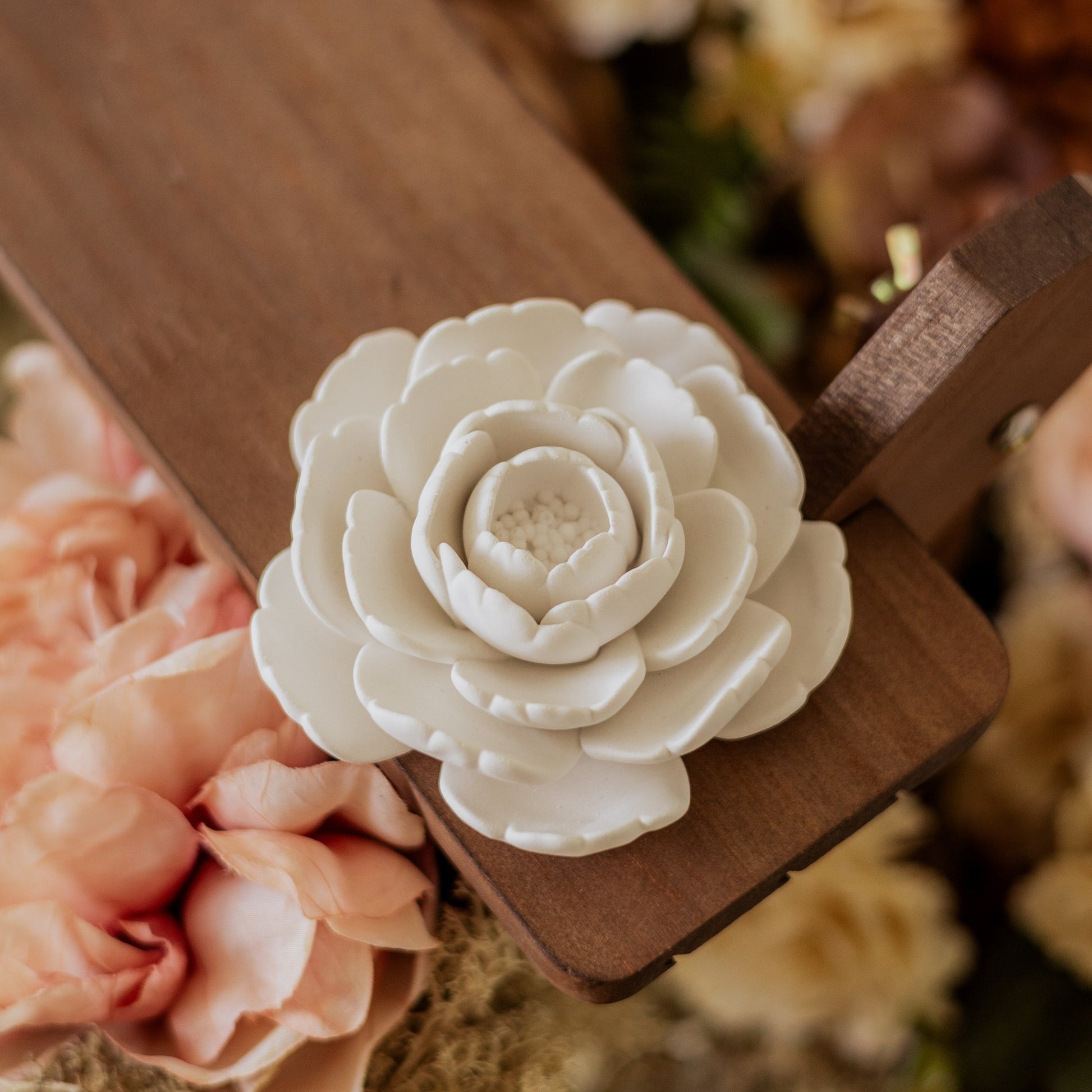 Flor de Camélia, com cerca de 8cmx8cm e aroma a talco. Ideal para perfumar e decorar o ambiente em qualquer altura.